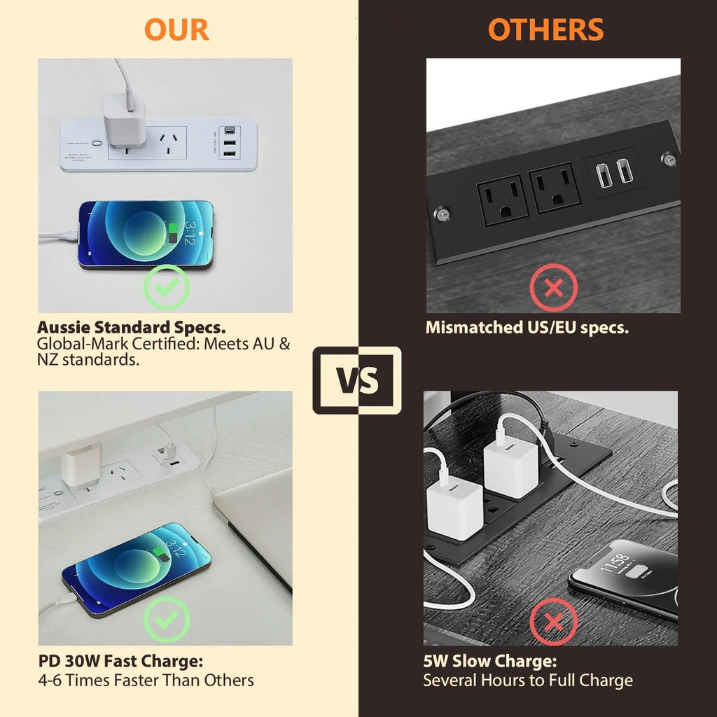 - This desk offers complete peace of mind with Australian Global-Mark electrical safety certification. Enjoy fast charging with PD 30W and USB Type-C support, plus added protection from lightning and power surges. The 1.78m flame-retardant cord ensures reliable power delivery. Enjoy the ultimate in safe electricity usage with this certified desk.