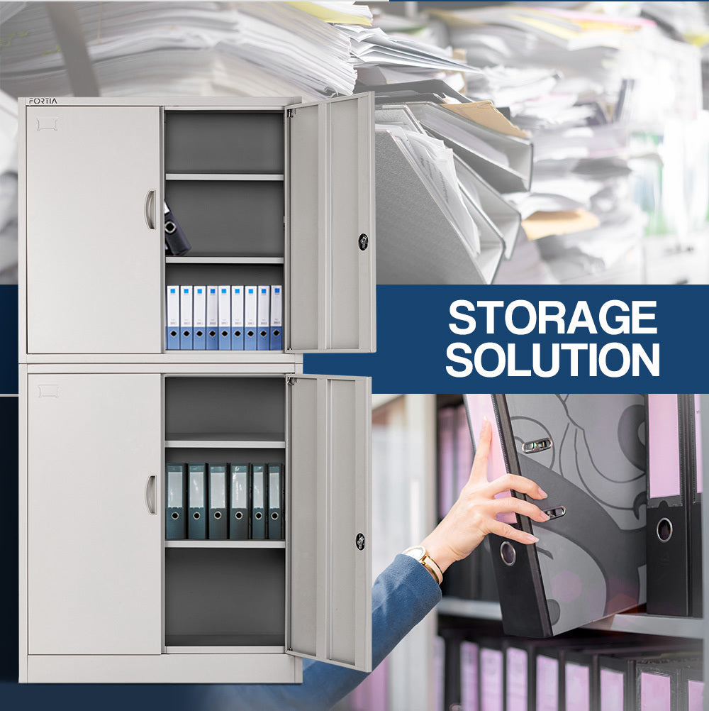 FORTIA 4-Door Steel Stationery Cabinet, Cam Locks, Shelves, Grey