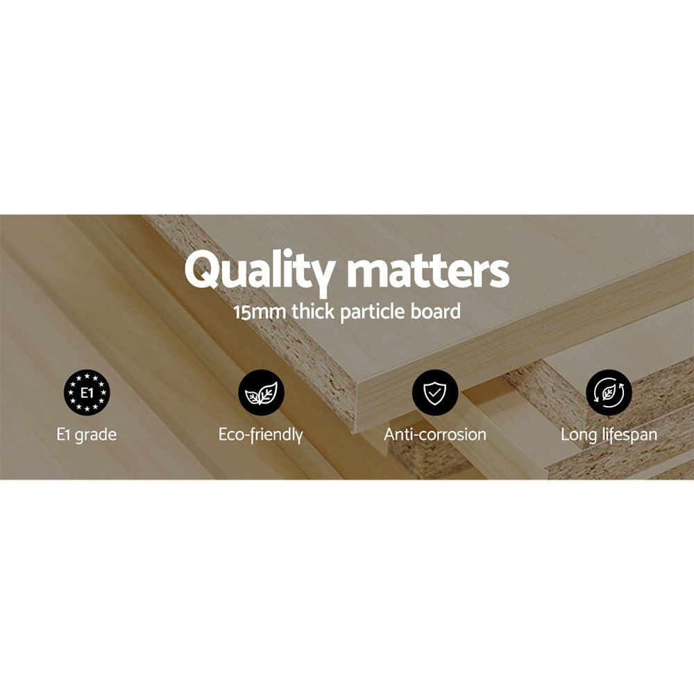 Want to add a WOW-effect to your living room? Our Artiss LED entertainment unit won’t disappoint you. Boasting a unique combination of functionality and creativity, this entertainment unit is designed to enhance your living space and create a pleasant ambience. The entertainment unit features built-in RGB LED lighting that you can customise into 16 different colours and four flashing modes with a touch of a button. It will perfectly complement your modern home décor and enable you to achieve a one-of-a-kind look. Having been constructed from 15mm thick particle board with melamine finish, this piece of furniture is quite sturdy and will withstand the test of time. It has spacious drawers with smooth metal runners for hassle-free operation and two tempered glass shelves to store all your entertainment paraphernalia. Bring this uniquely designed entertainment unit for your home today.